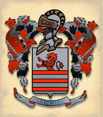 L'arma della Casata D'Angieri, qui riprodotta a colori nel linguaggio tecnico-araldico del blasone, così si presenta: d'argento, a tre fasce in divisa di rosso, con il leone dello stesso nascente dalla prima fascia.